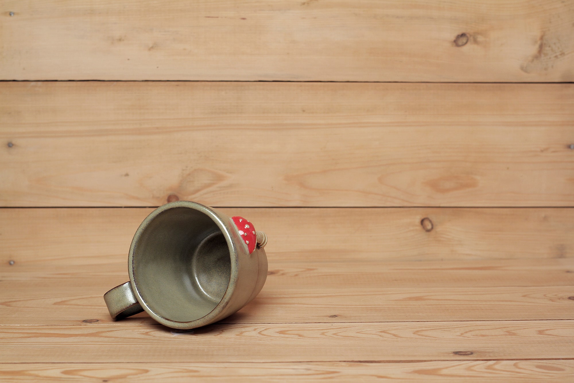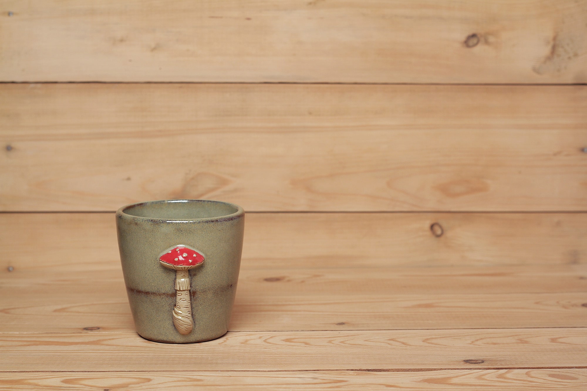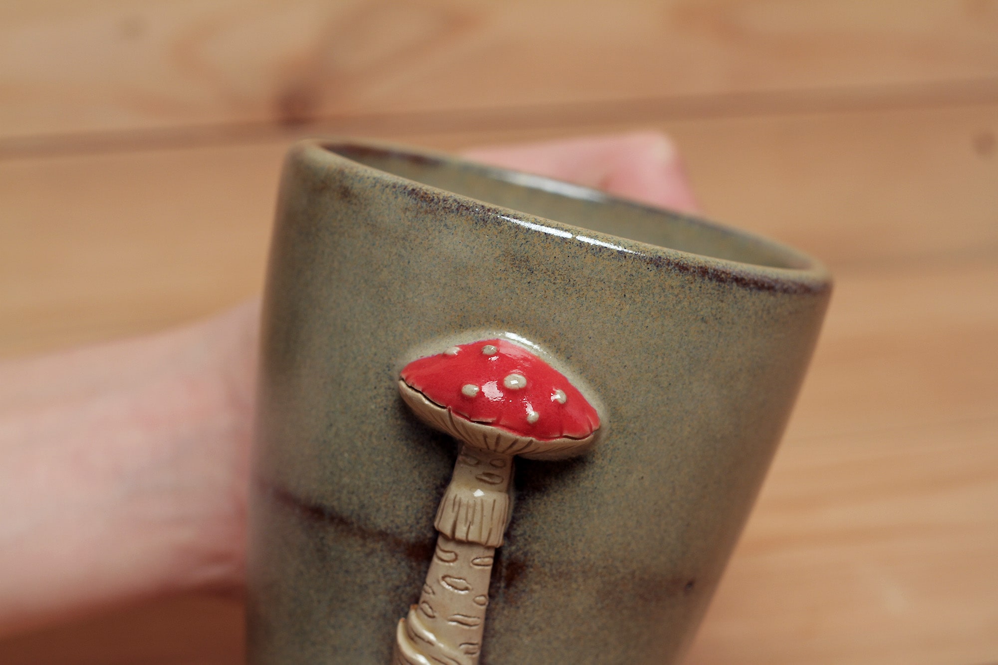 Fehér agyagból készült, magastűzön, 1225 fokon tömörre égetett gomba szobros bögre. Effekt és transzparens mázzal kívül-belül díszítve.