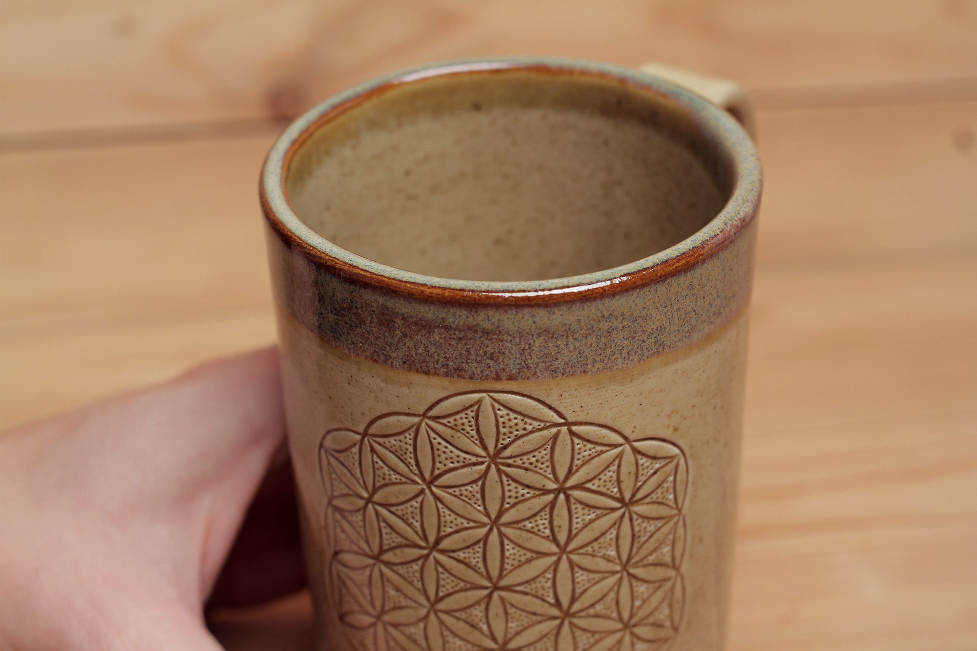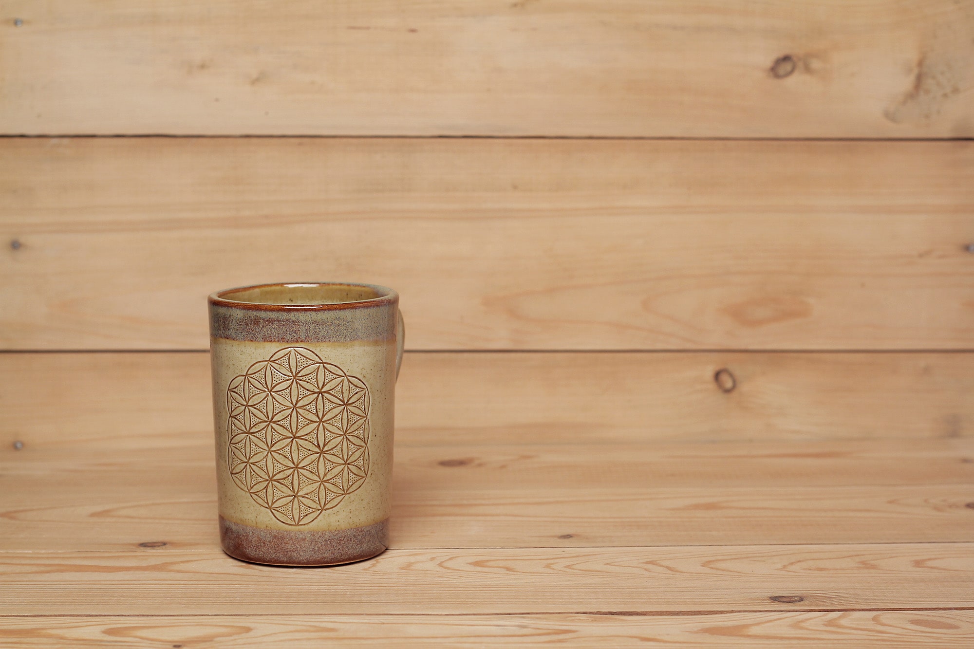 Fehér agyagból készült, magastűzön, 1225 fokon tömörre égetett Életvirág mintás bögre karcolt technikával. Lilás-barna effekt és barnás transzparens mázzal kívül-belül díszítve.