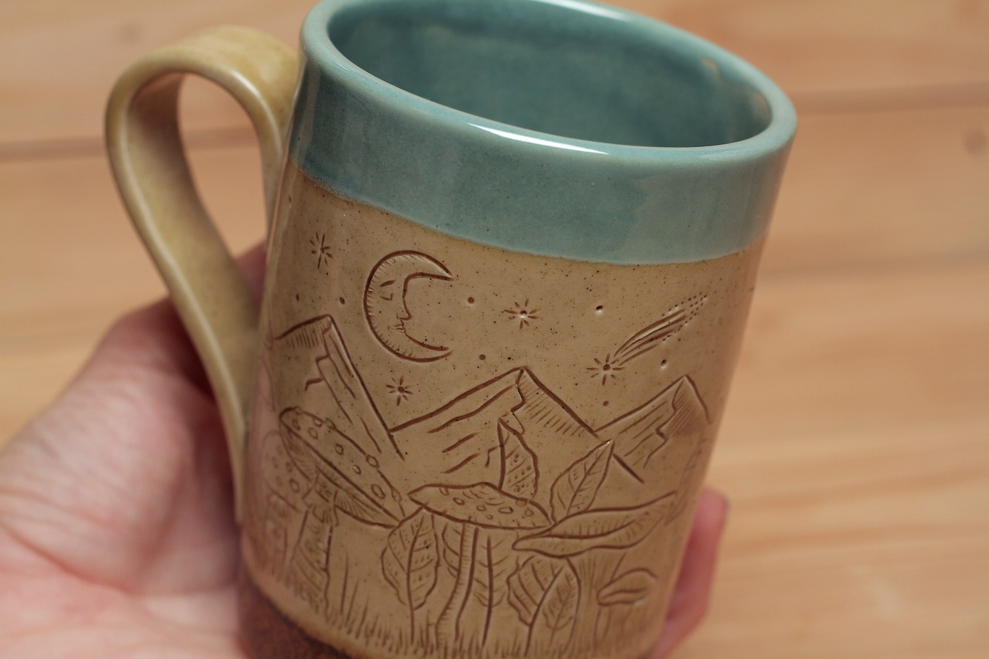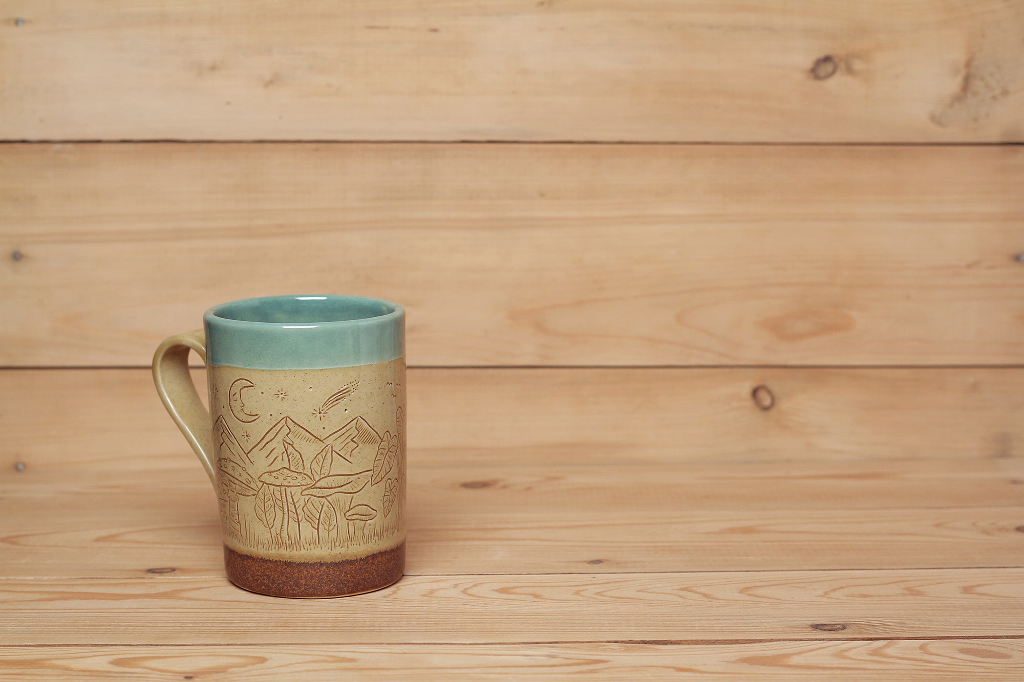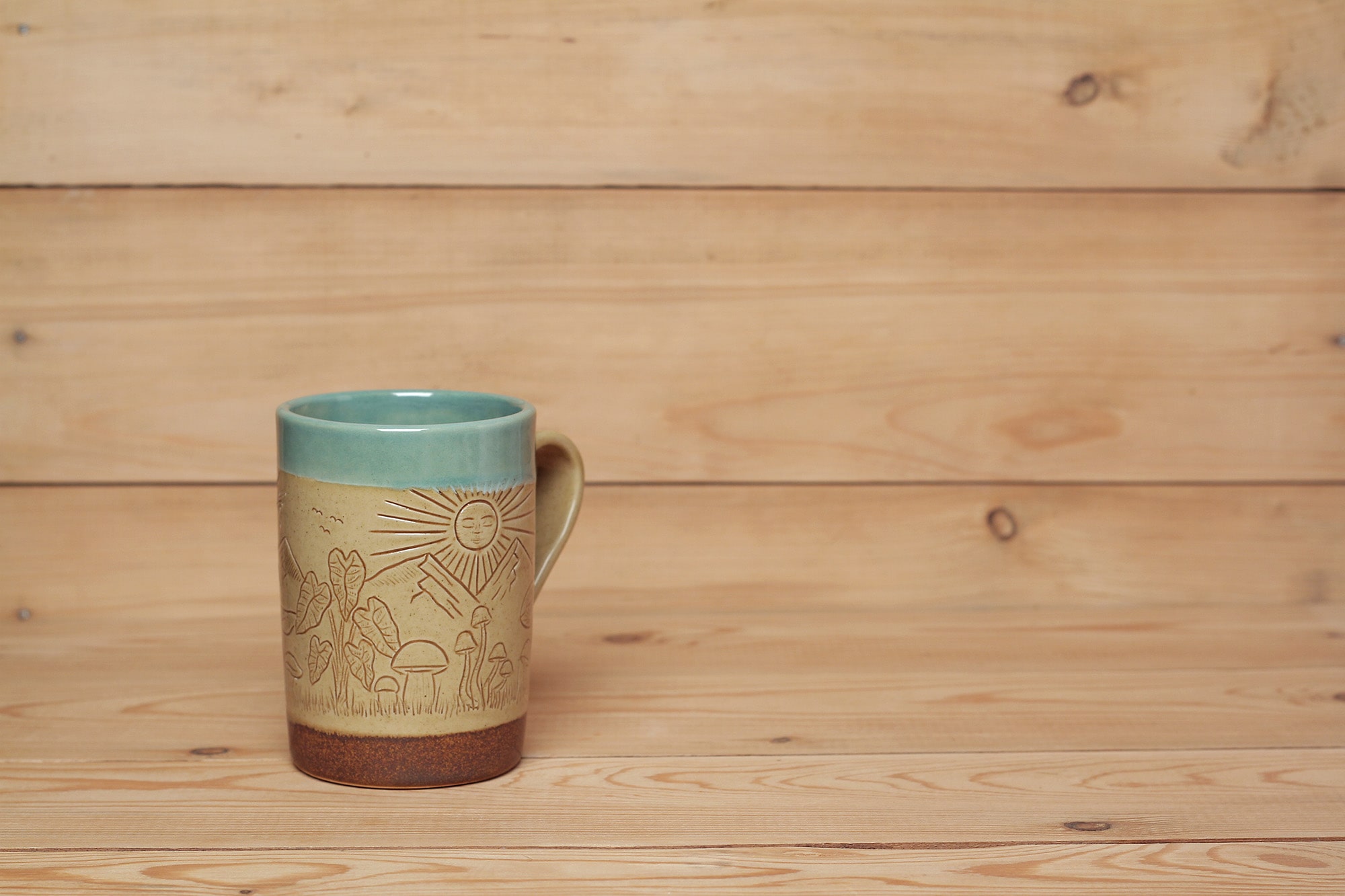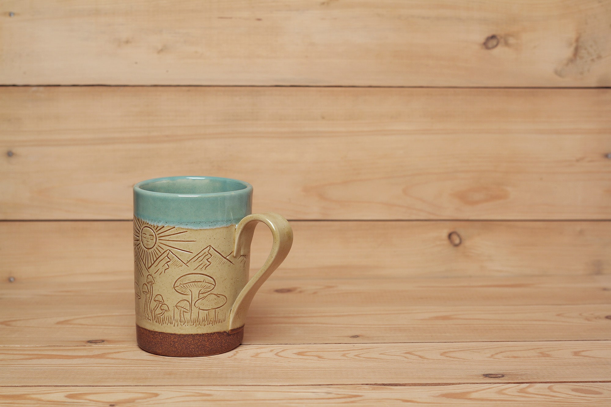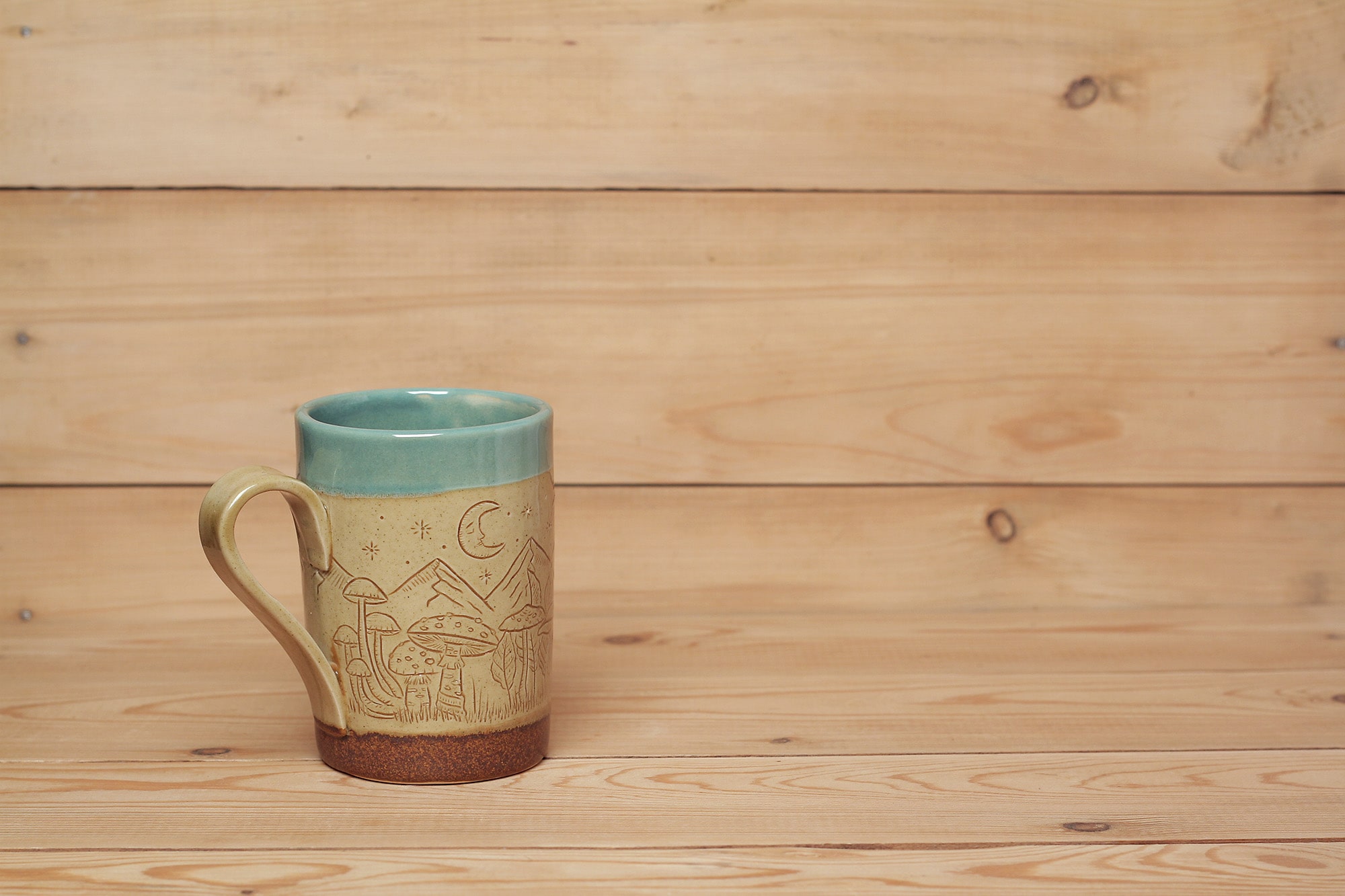Fehér agyagból készült, magastűzön, 1225 fokon tömörre égetett gomba és növény mintás pohár karcolt technikával. Kék effekt, valamint barnás transzparens mázzal kívül-belül díszítve.