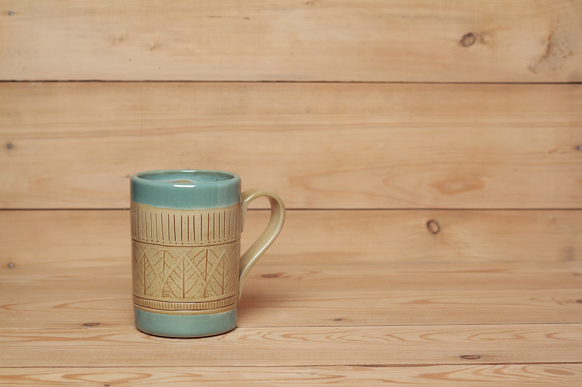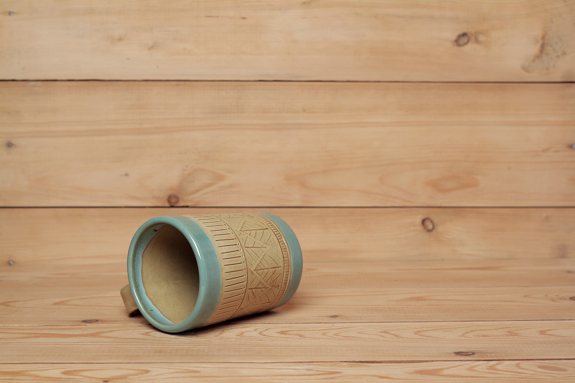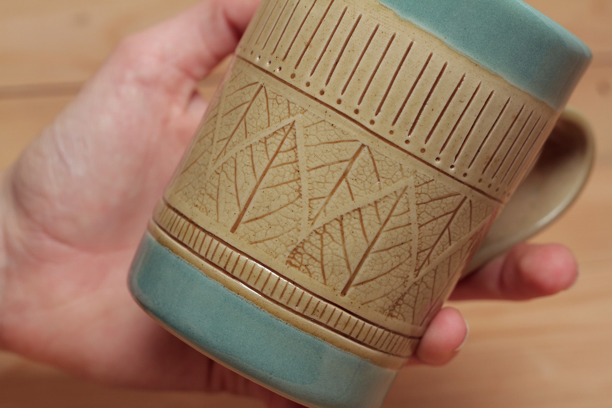 Fehér agyagból készült, magastűzön, 1225 fokon tömörre égetett zsálya levél mintás pohár karcolt technikával. Kék effekt és barnás transzparens mázzal kívül-belül díszítve. Valódi zsálya levél lenyomat díszíti rajzzal sormintában, így mindegyik darab egyedi, nincs belőle két ugyanolyan.