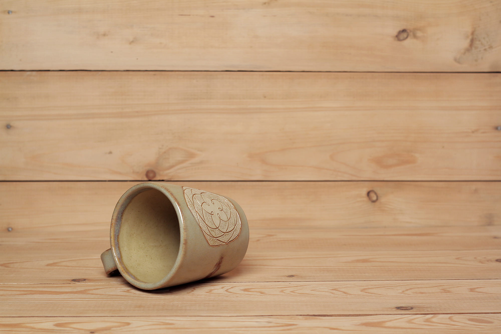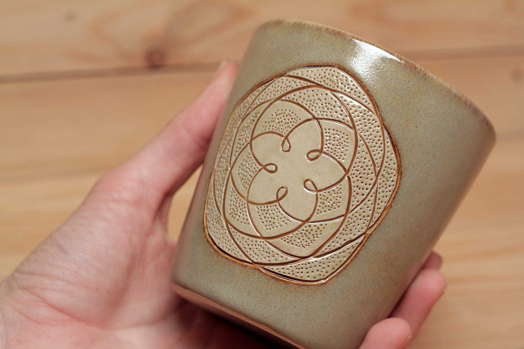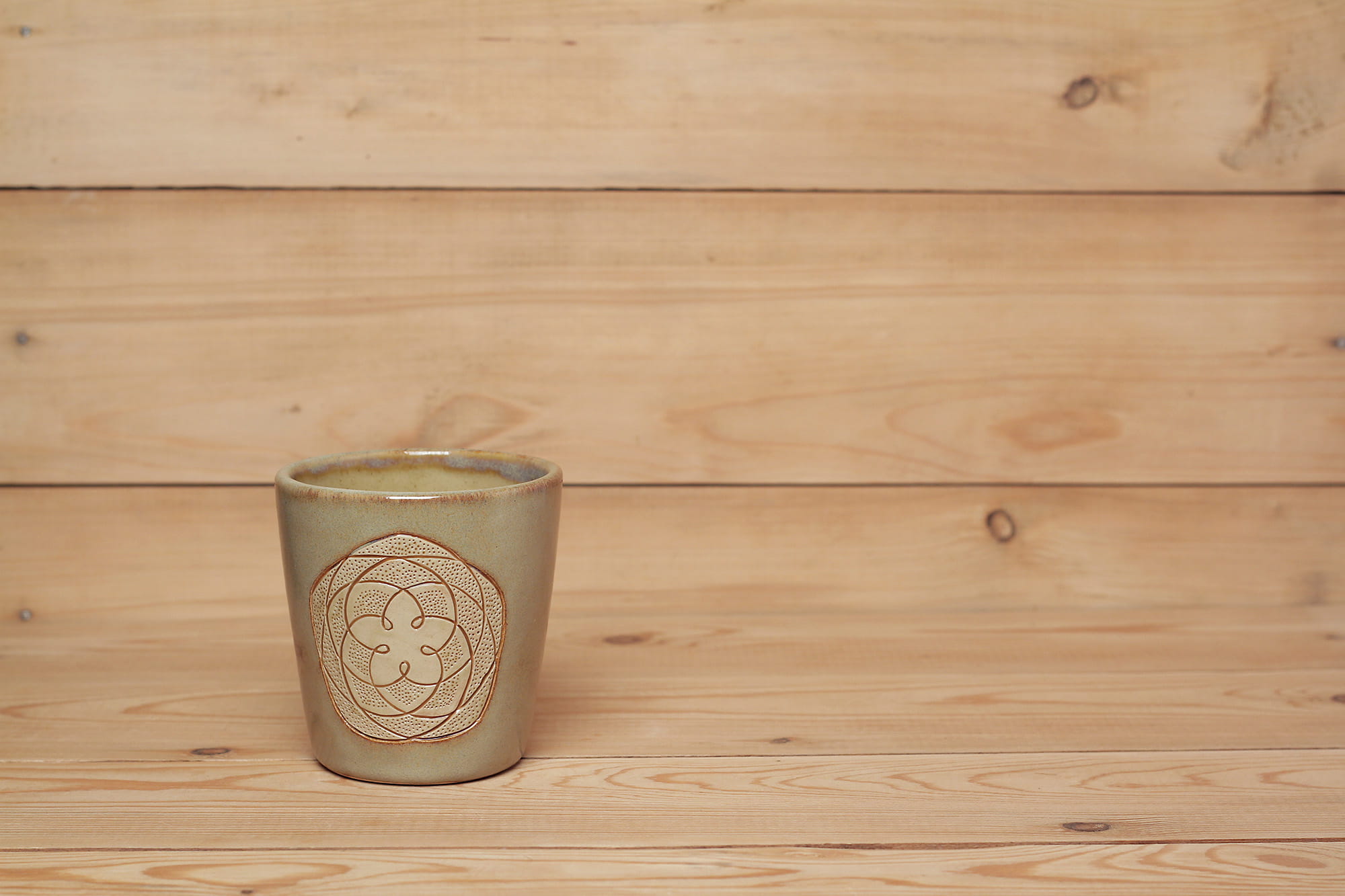 Fehér agyagból készült, magastűzön, 1225 fokon tömörre égetett Vénusz Rószája mintás pohár karcolt technikával. Sötéték effekt és barnás transzparens mázzal kívül-belül díszítve.