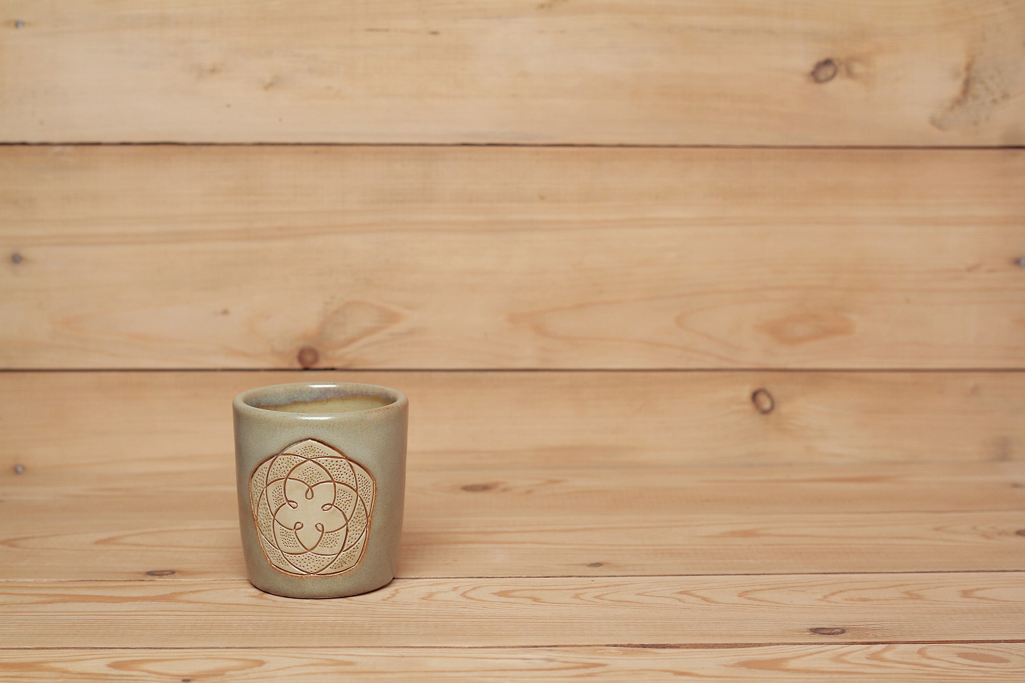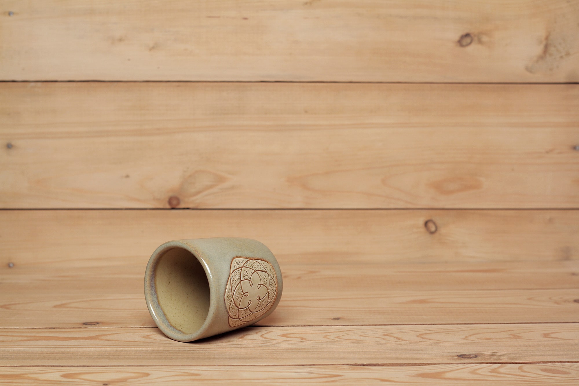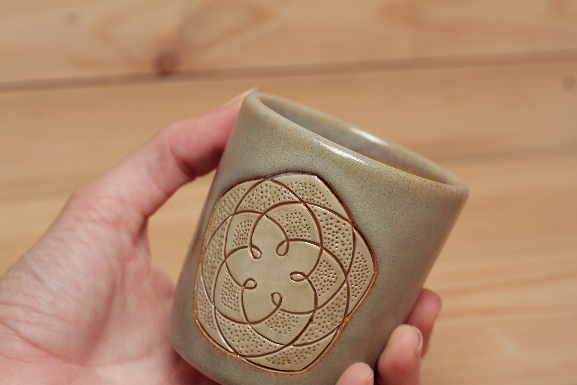 Fehér agyagból készült, magastűzön, 1225 fokon tömörre égetett Vénusz Rószája mintás csésze karcolt technikával. Homokszínű effekt és barnás transzparens mázzal kívül-belül díszítve.