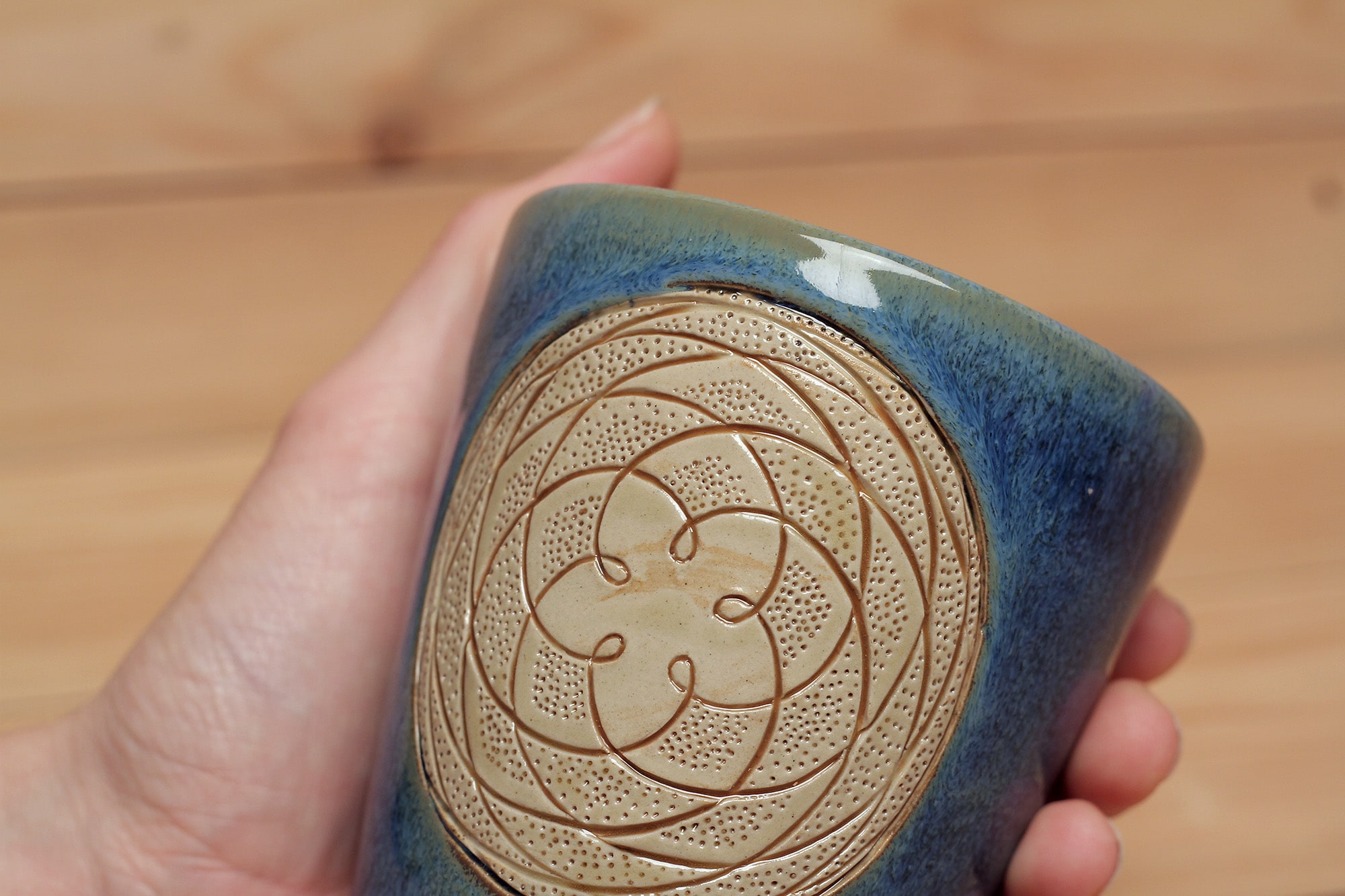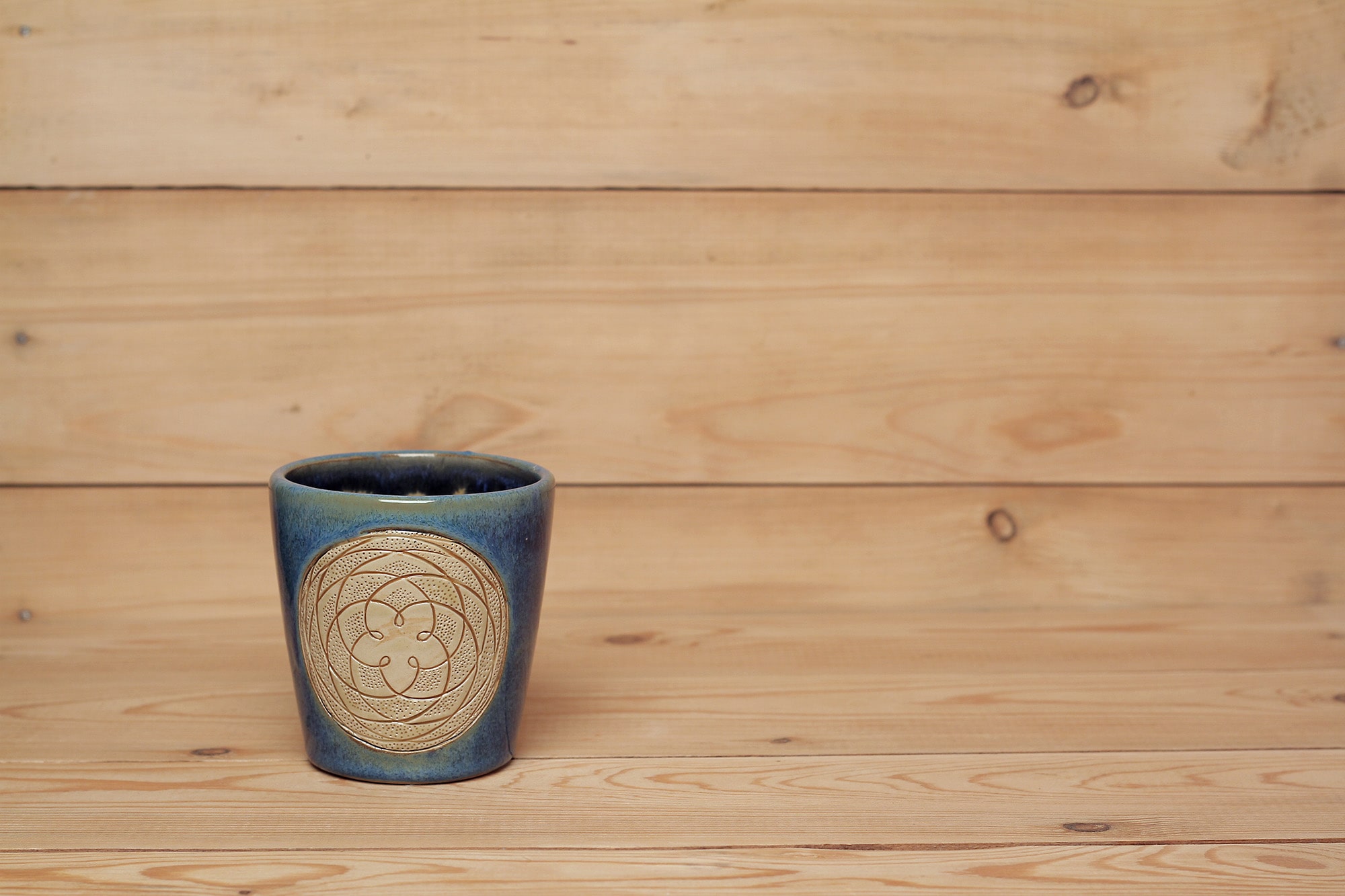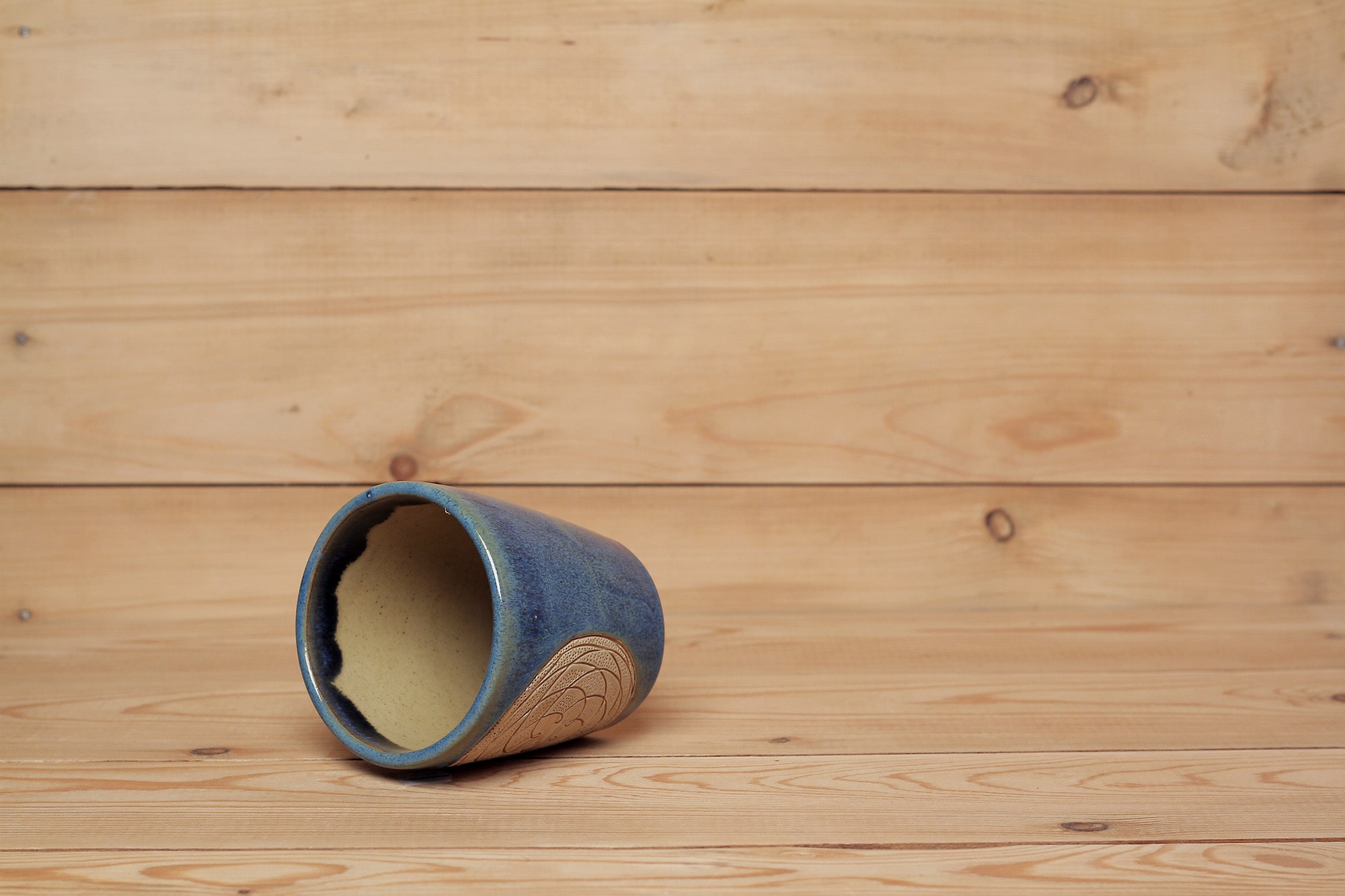 Fehér agyagból készült, magastűzön, 1225 fokon tömörre égetett Vénusz Rószája mintás pohár karcolt technikával. Sötéték effekt és barnás transzparens mázzal kívül-belül díszítve.