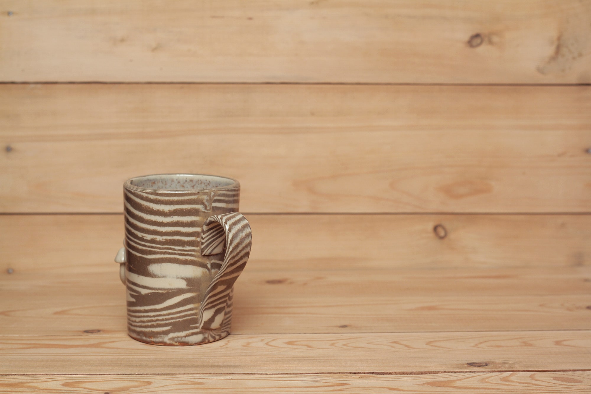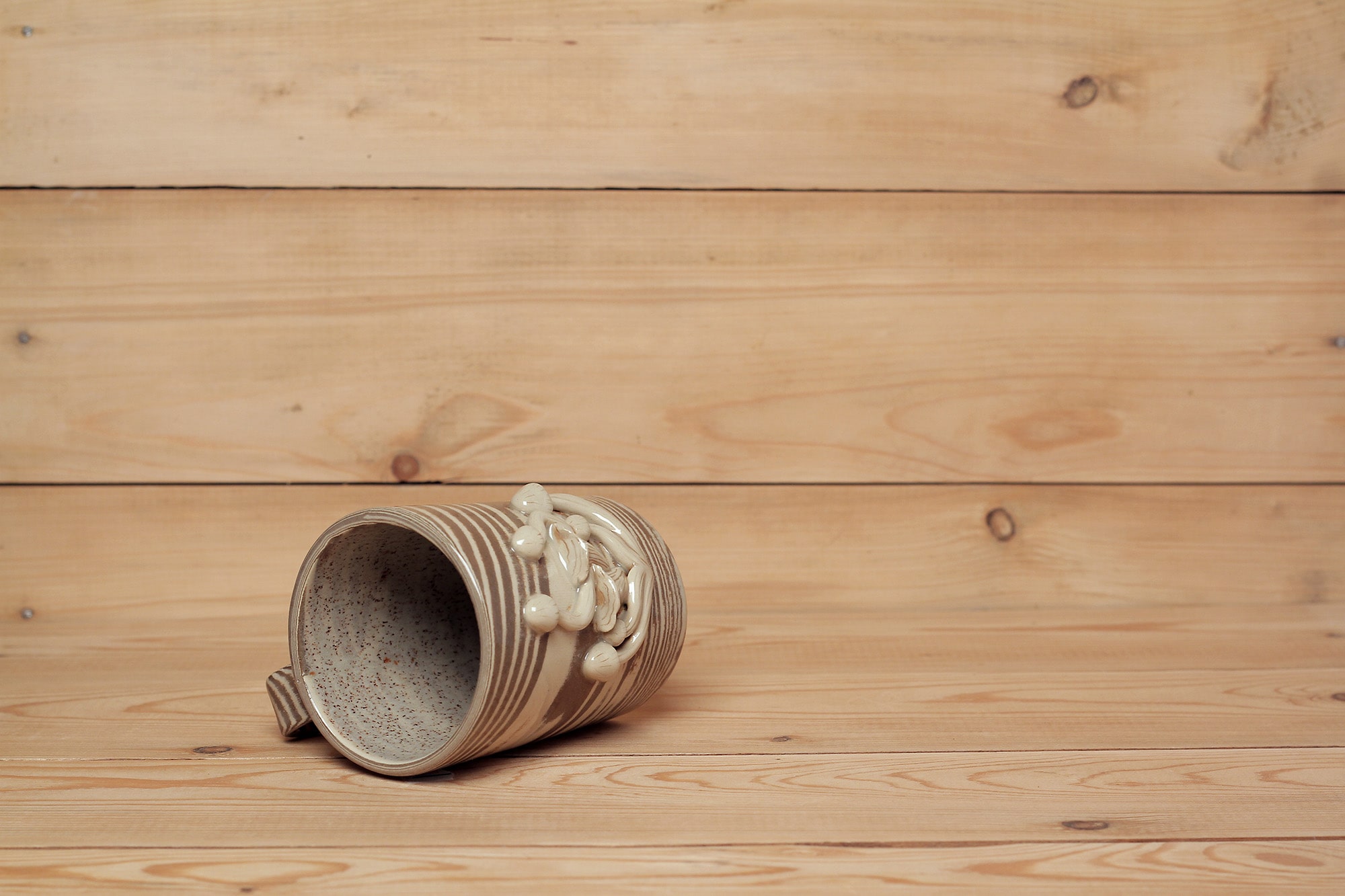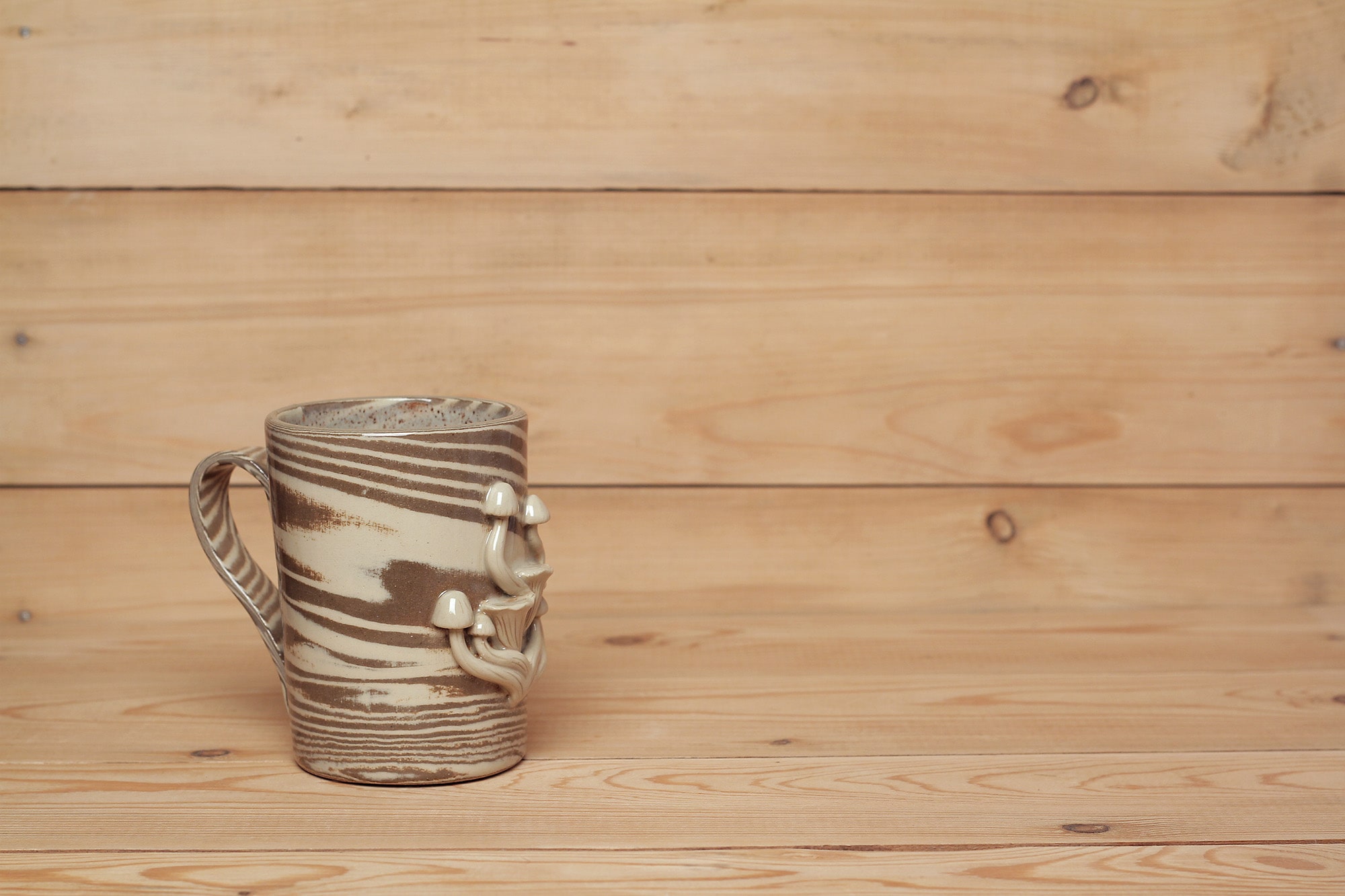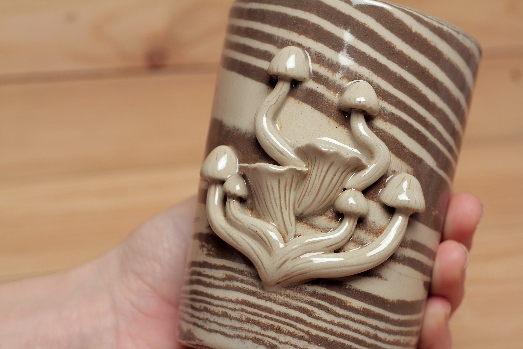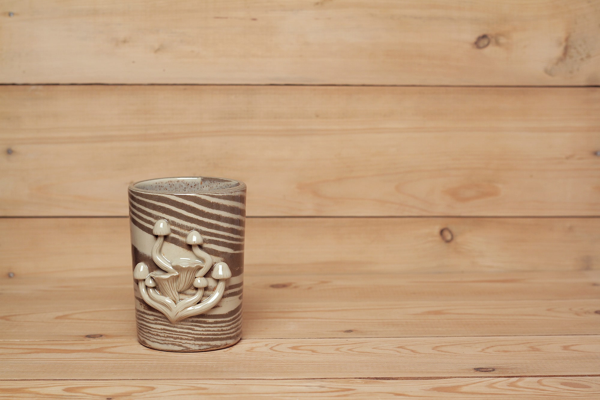 Fehér és barna agyagból „márványos” technikával készült, magastűzön, 1225 fokon tömörre égetett gomba mintás bögre szobortechnikával. Belül mákos hatású fehér mázzal,kívül pedig transzparens mázzal díszítve.