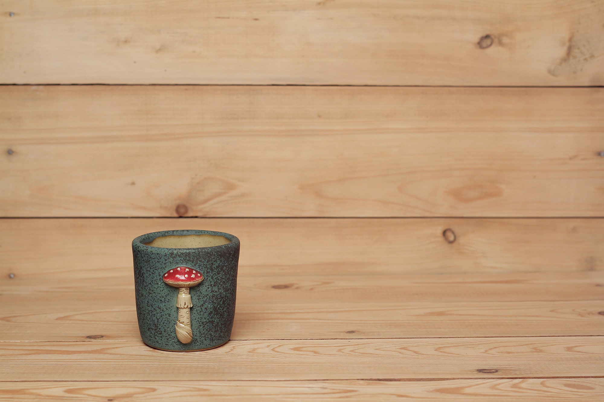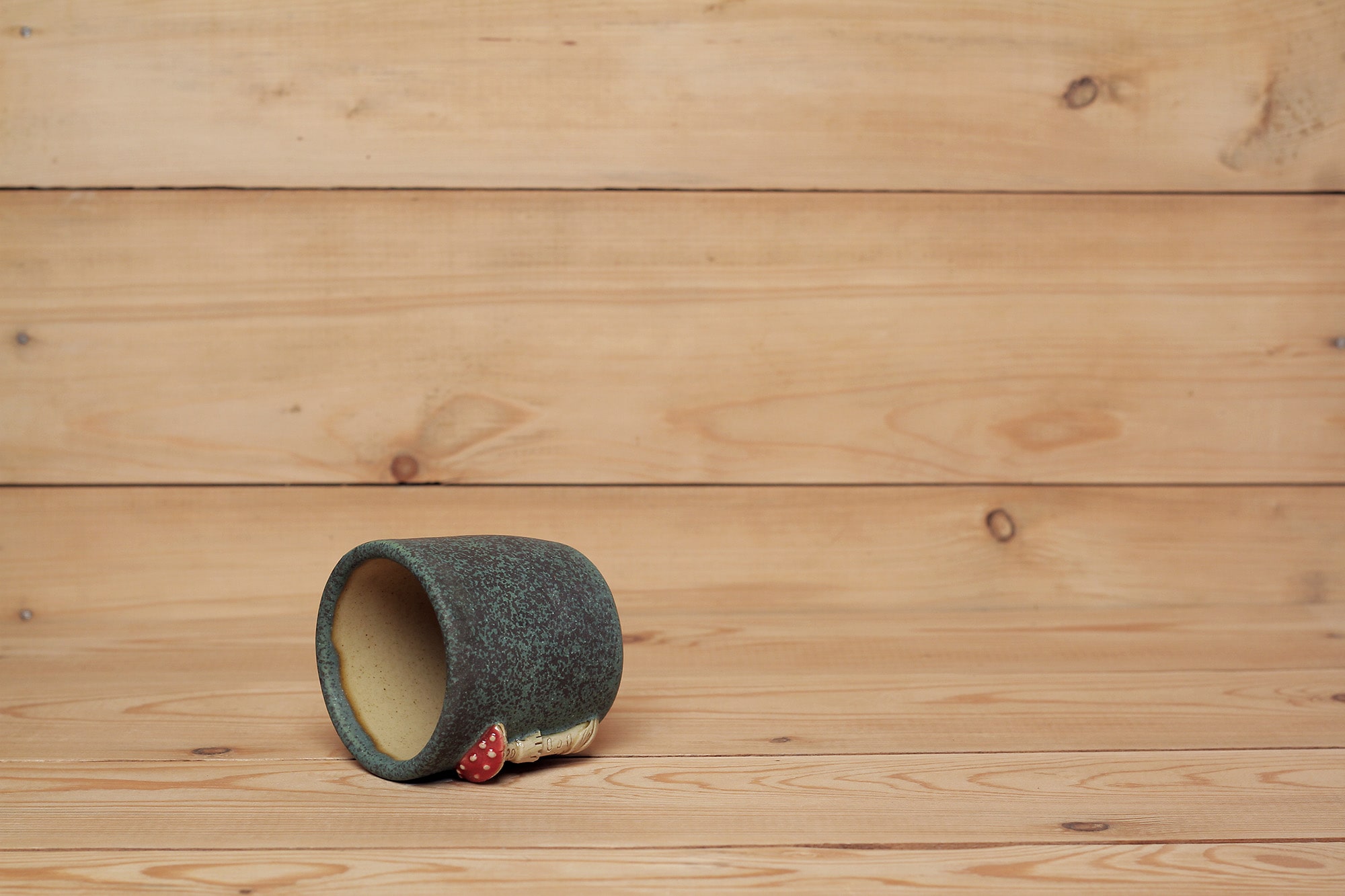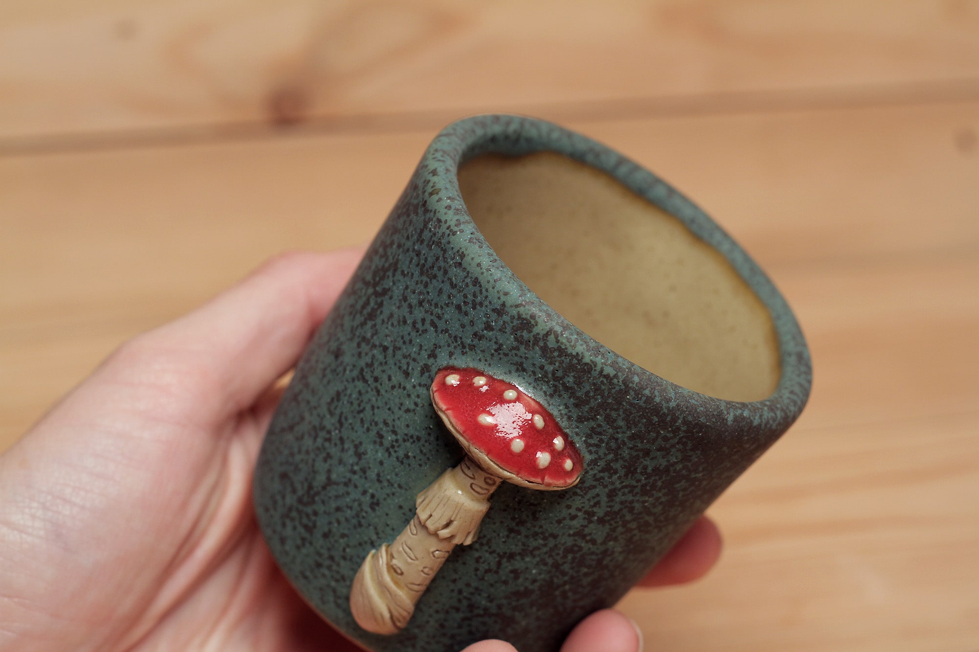 Fehér agyagból készült, magastűzön, 1225 fokon tömörre égetett Amanita muscaria mintás csésze szobortechnikával. Zöld effekt és barnás transzparens mázzal kívül-belül díszítve.