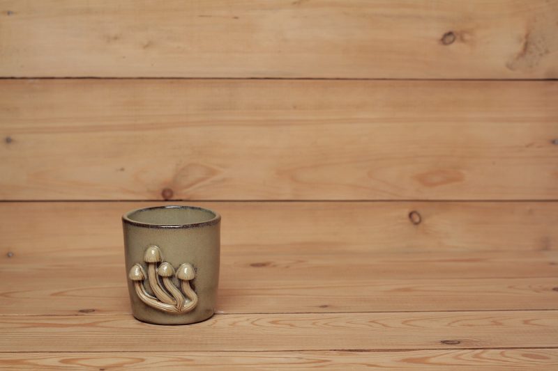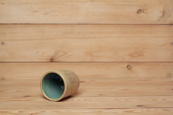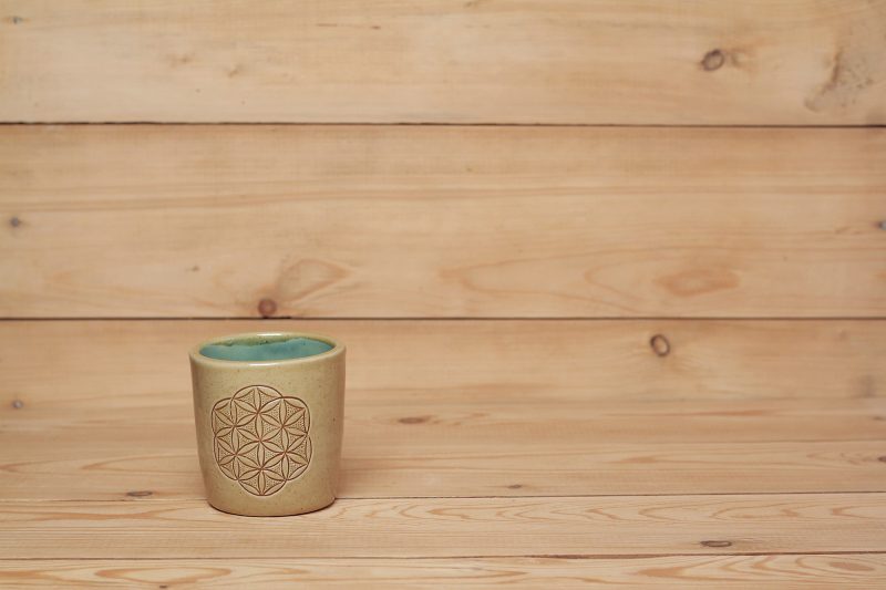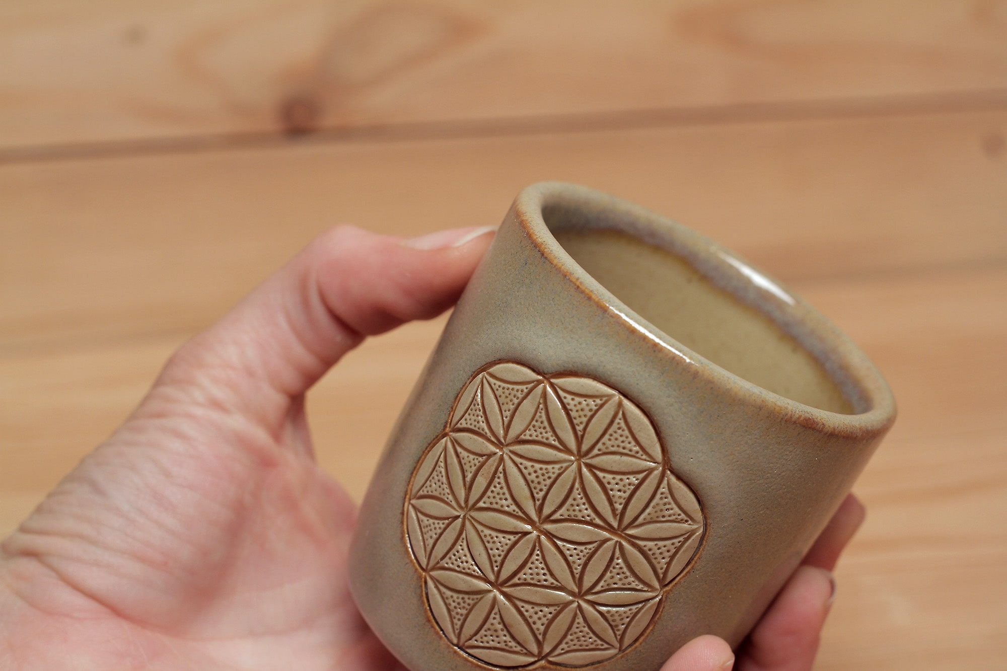 Fehér agyagból készült, magastűzön, 1225 fokon tömörre égetett Életvirága mintás csésze szobortechnikával.