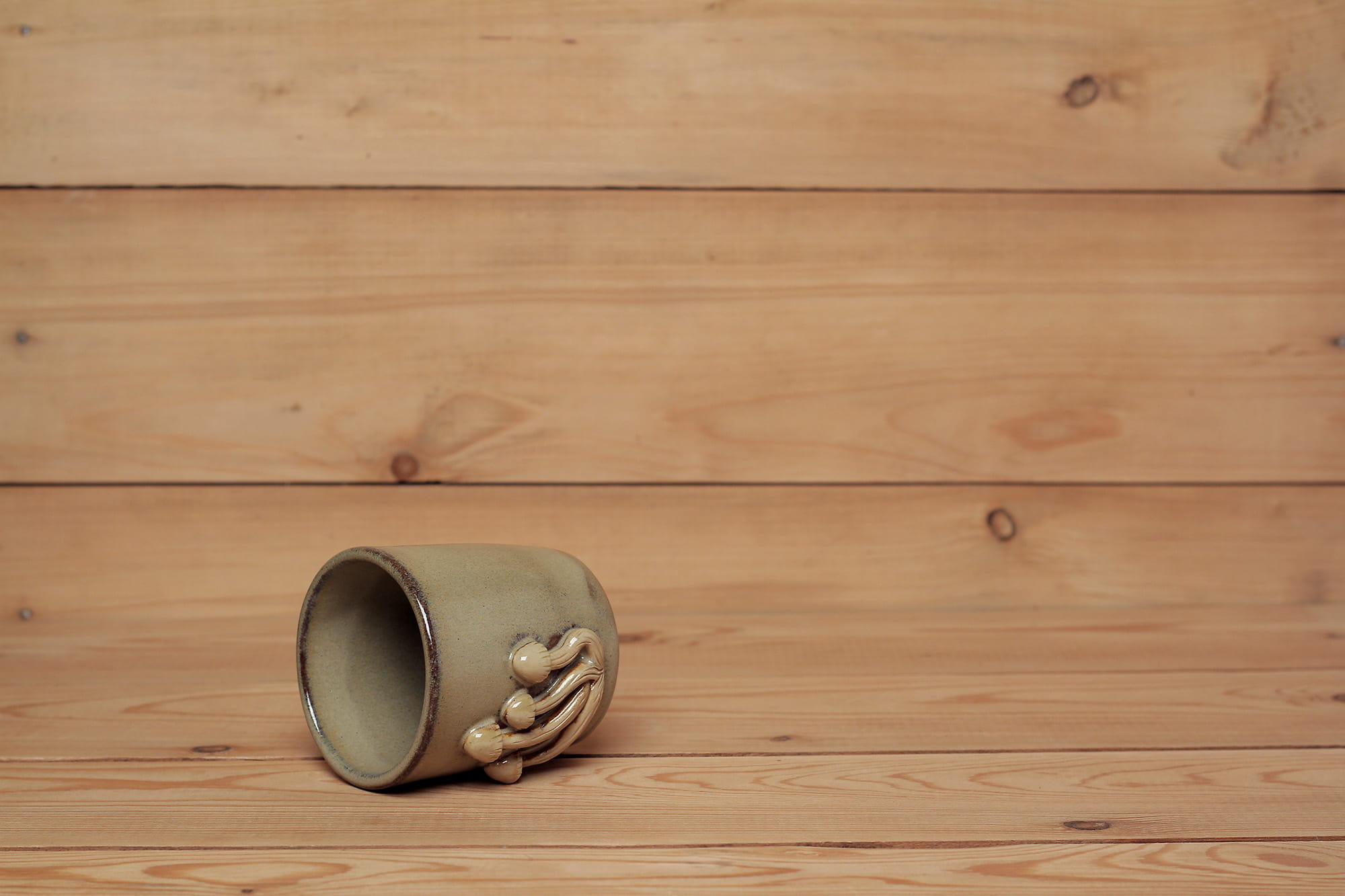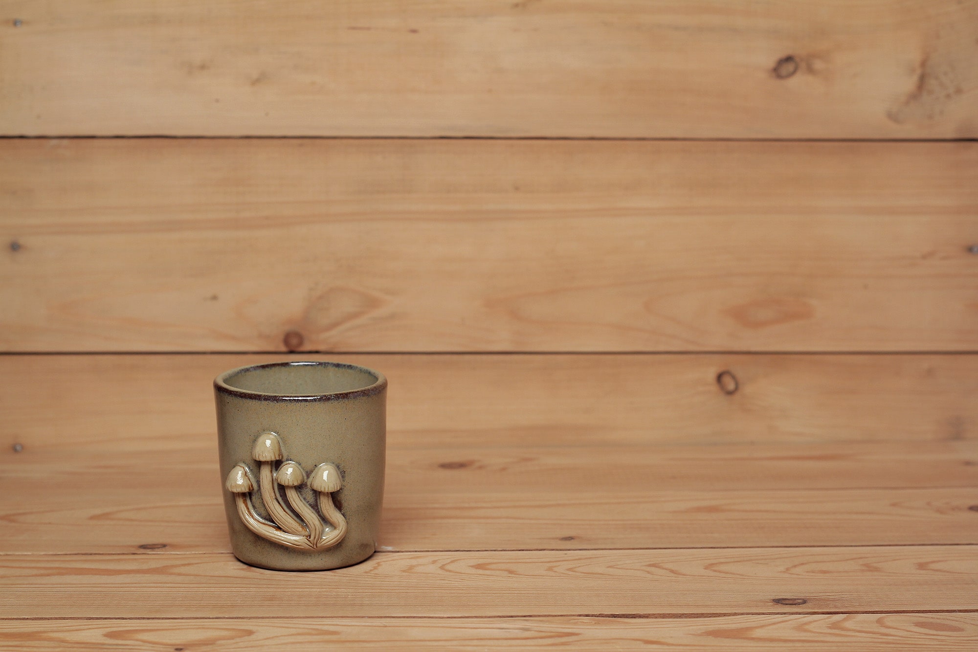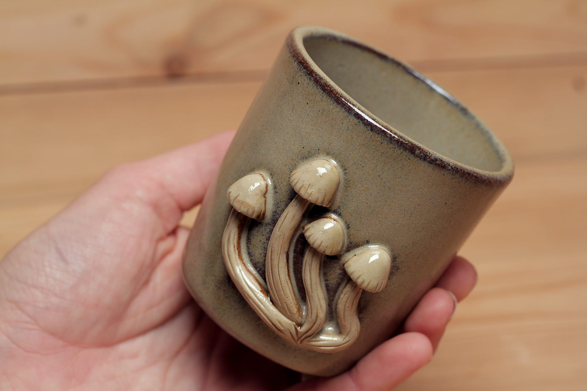 Fekete agyagból készült, magastűzön, 1225 fokon tömörre égetett gomba mintás csésze, karcolt technikával.