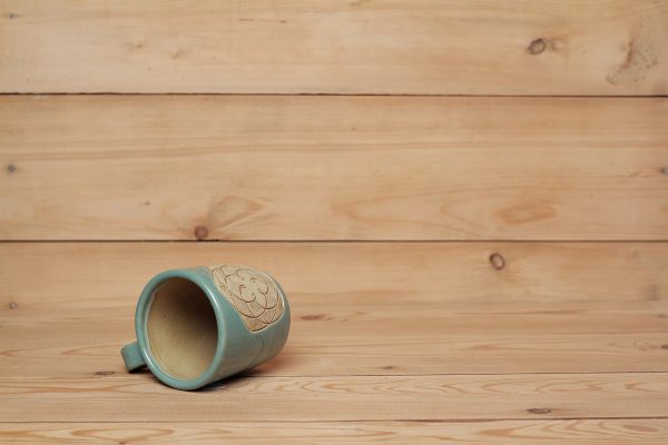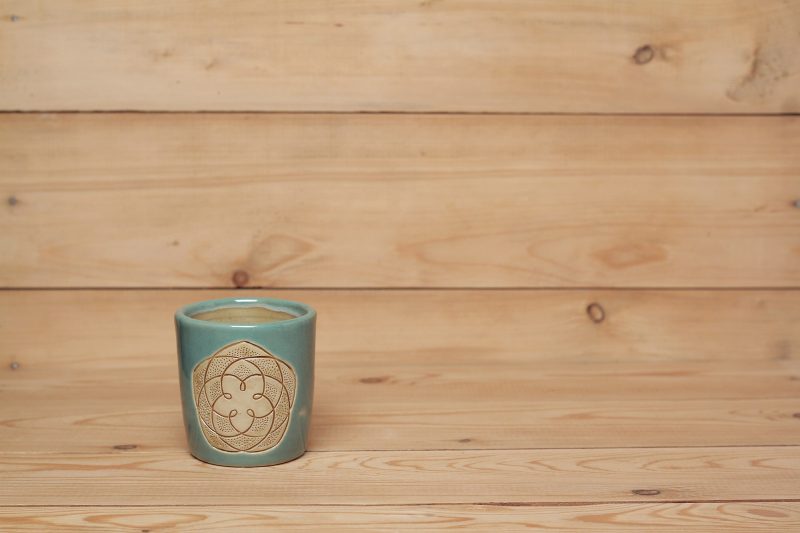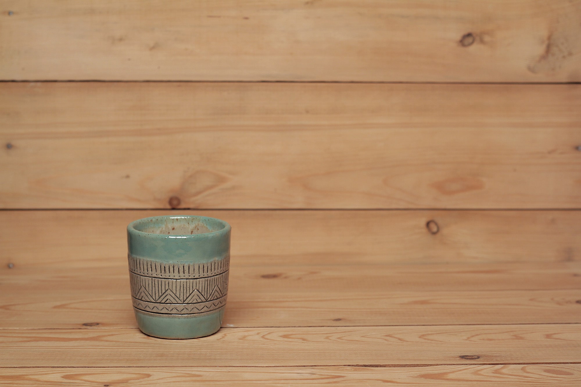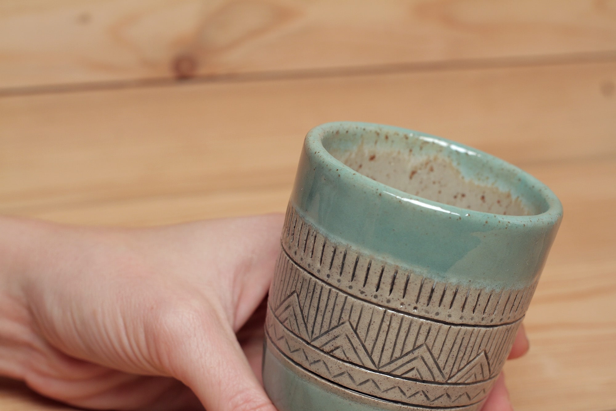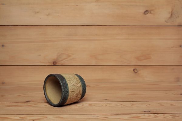 Szörke, erősen samottos agyagból készült, magastűzön, 1225 fokon tömörre égetett mintás csésze, karcolt technikával.