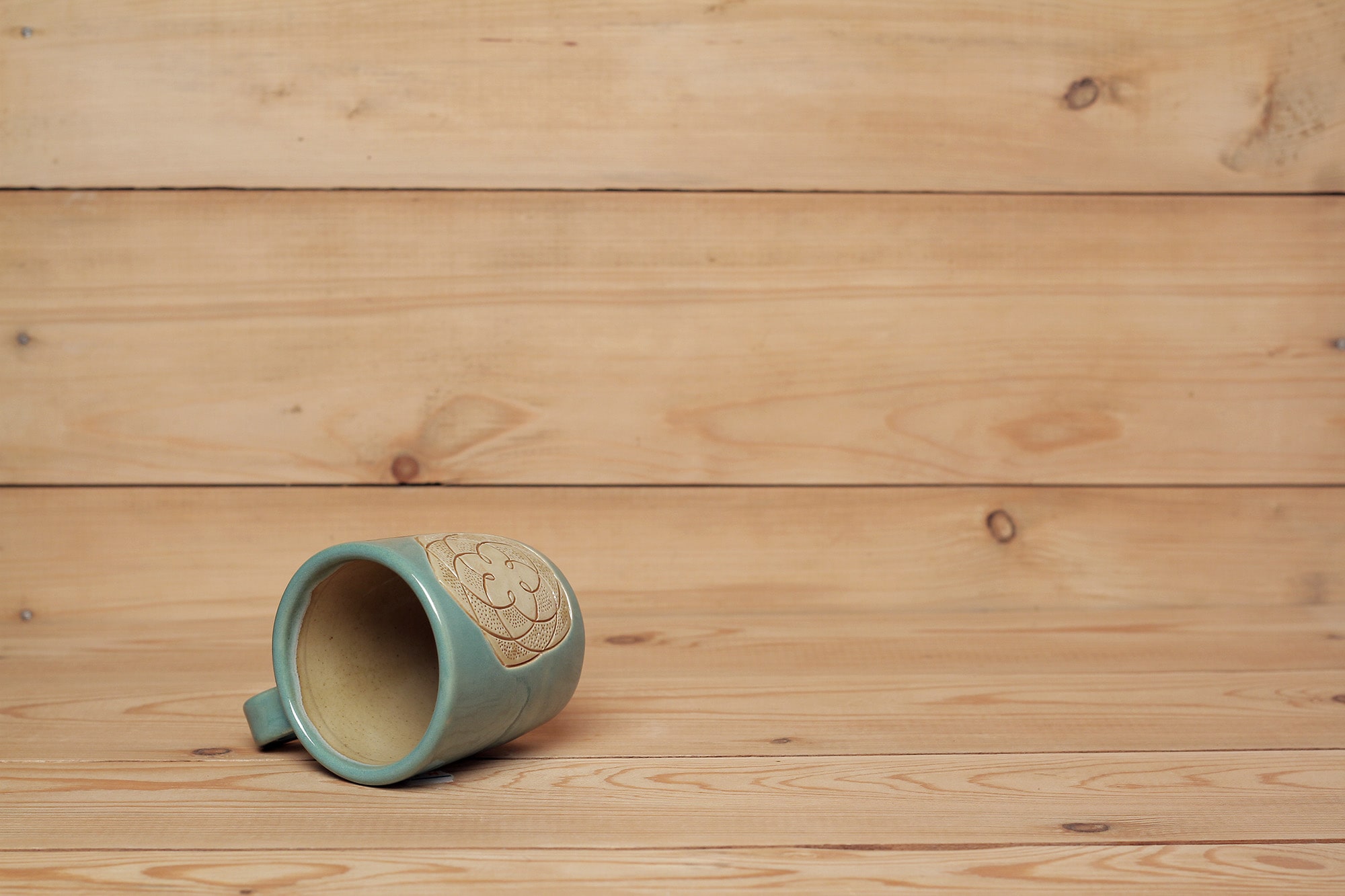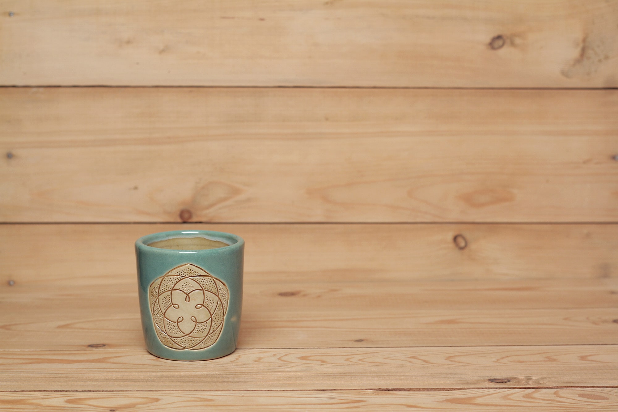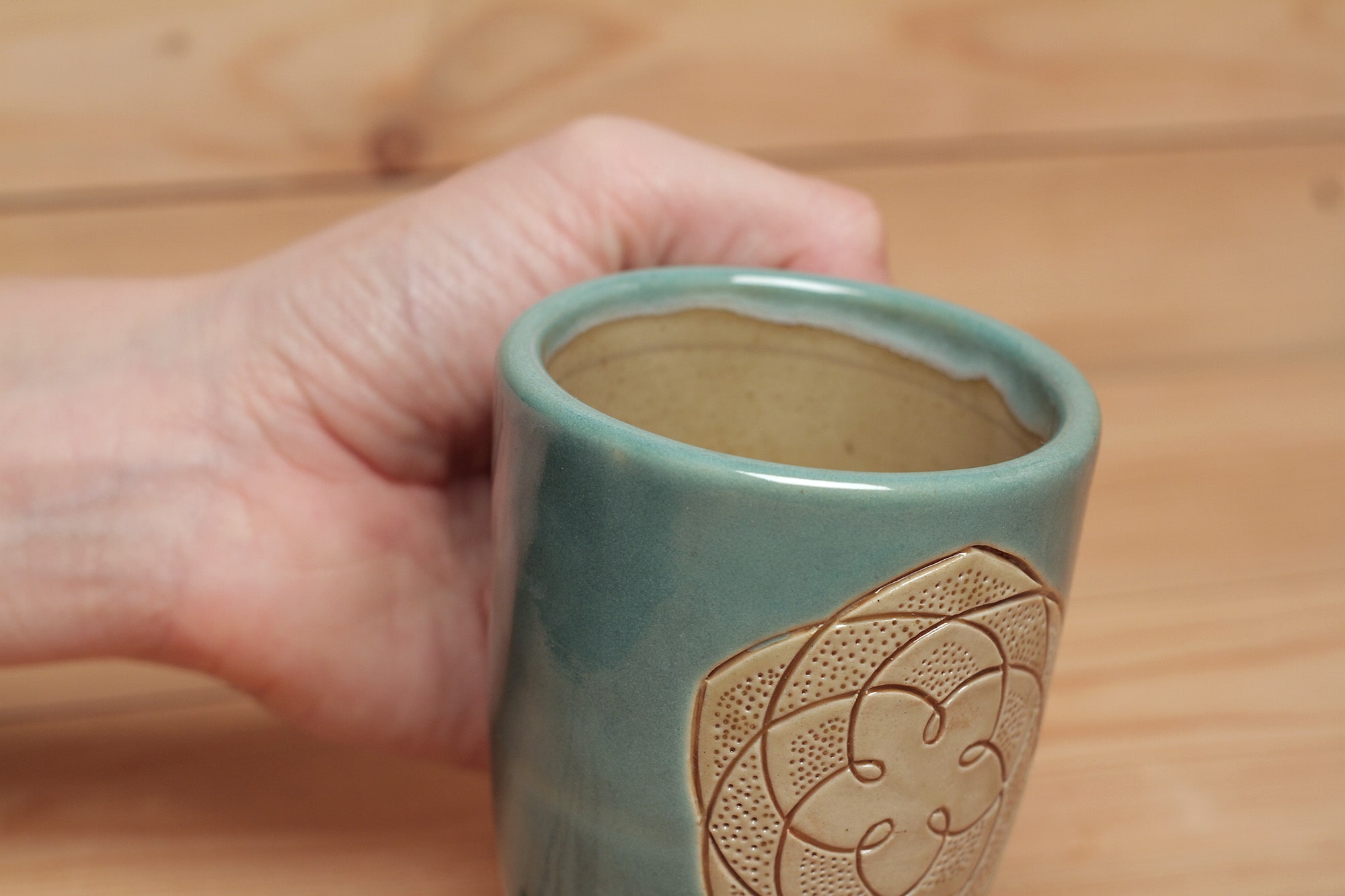 Fehér agyagból készült, magastűzön, 1225 fokon tömörre égetett Vénusz Rószája mintás csésze karcolt technikával. Kék effekt és barnás transzparens mázzal kívül-belül díszítve.