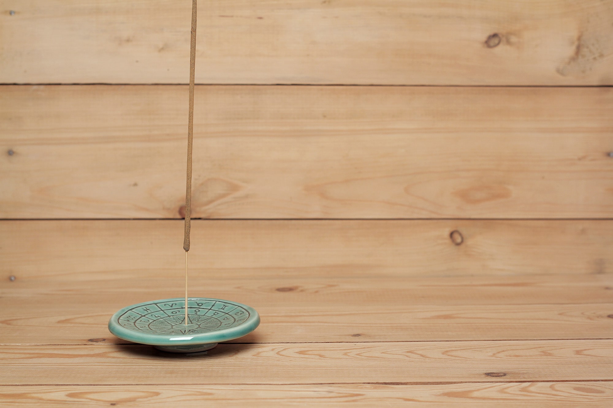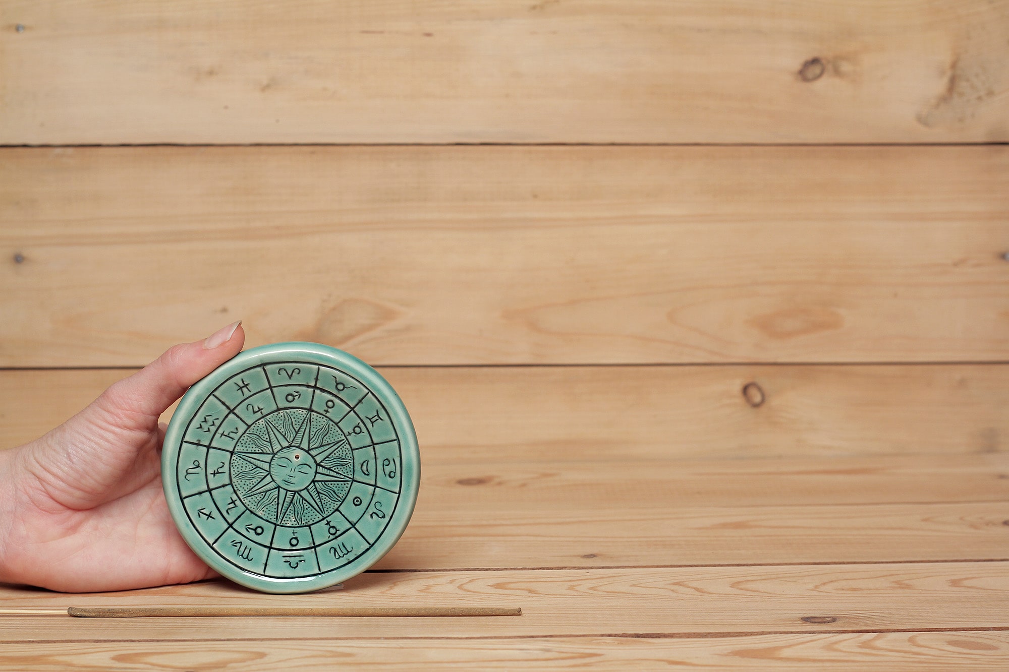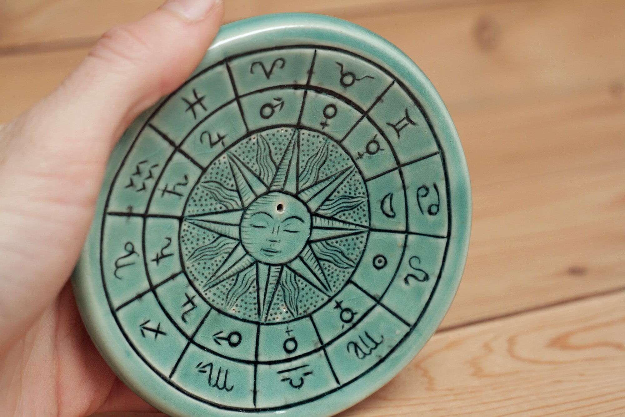 Fehér agyagból készült, magastűzön, 1225 fokon tömörre égetett Zodiákus kör mintás füstölőtartó türkiszzöld transzparens mázzal díszítve.