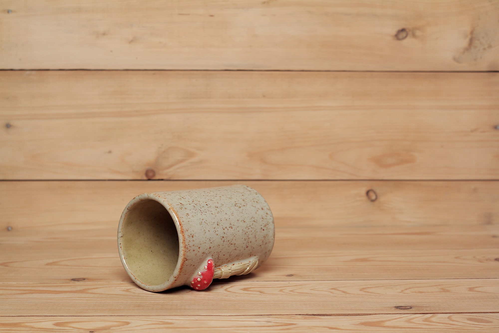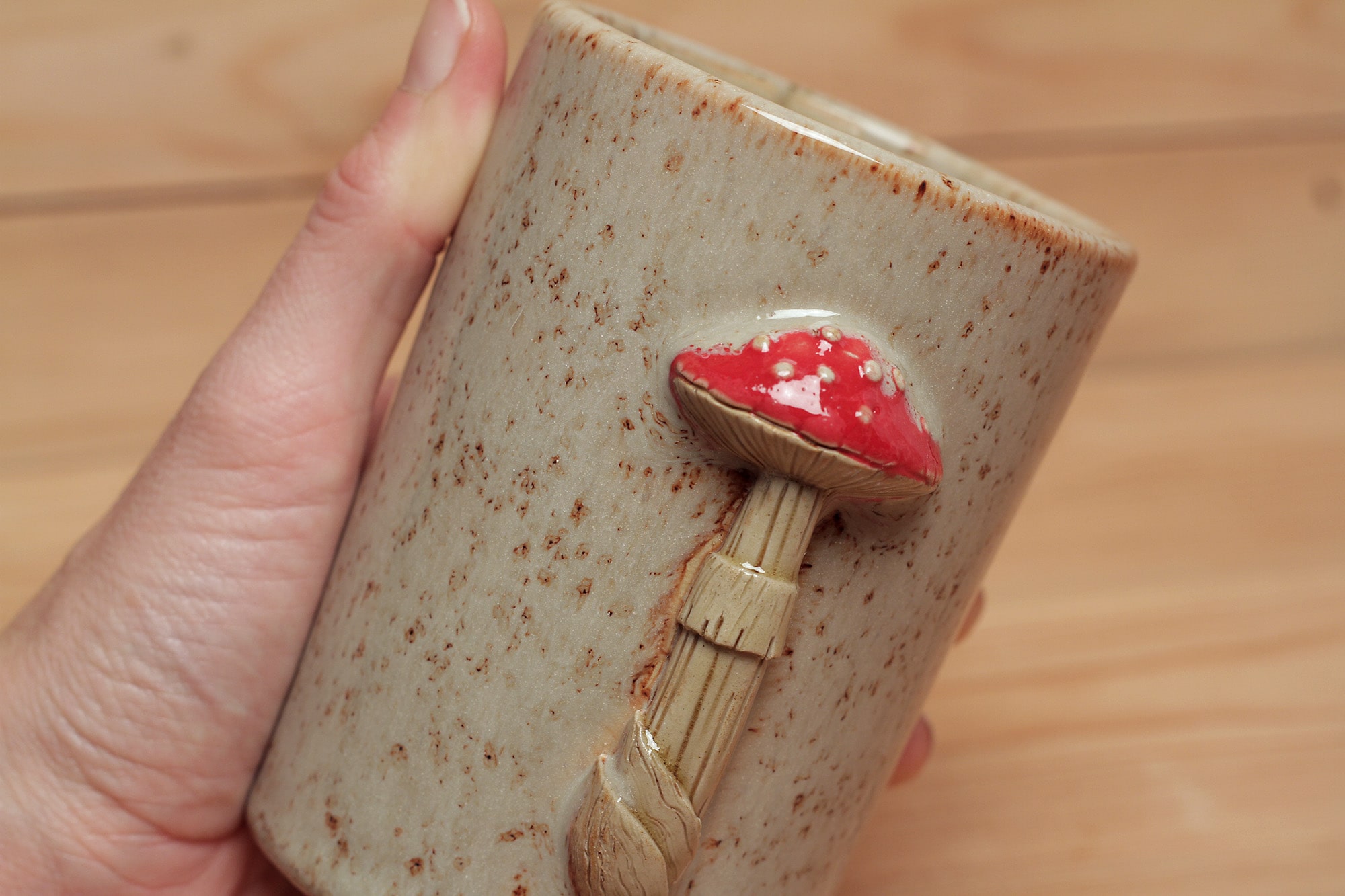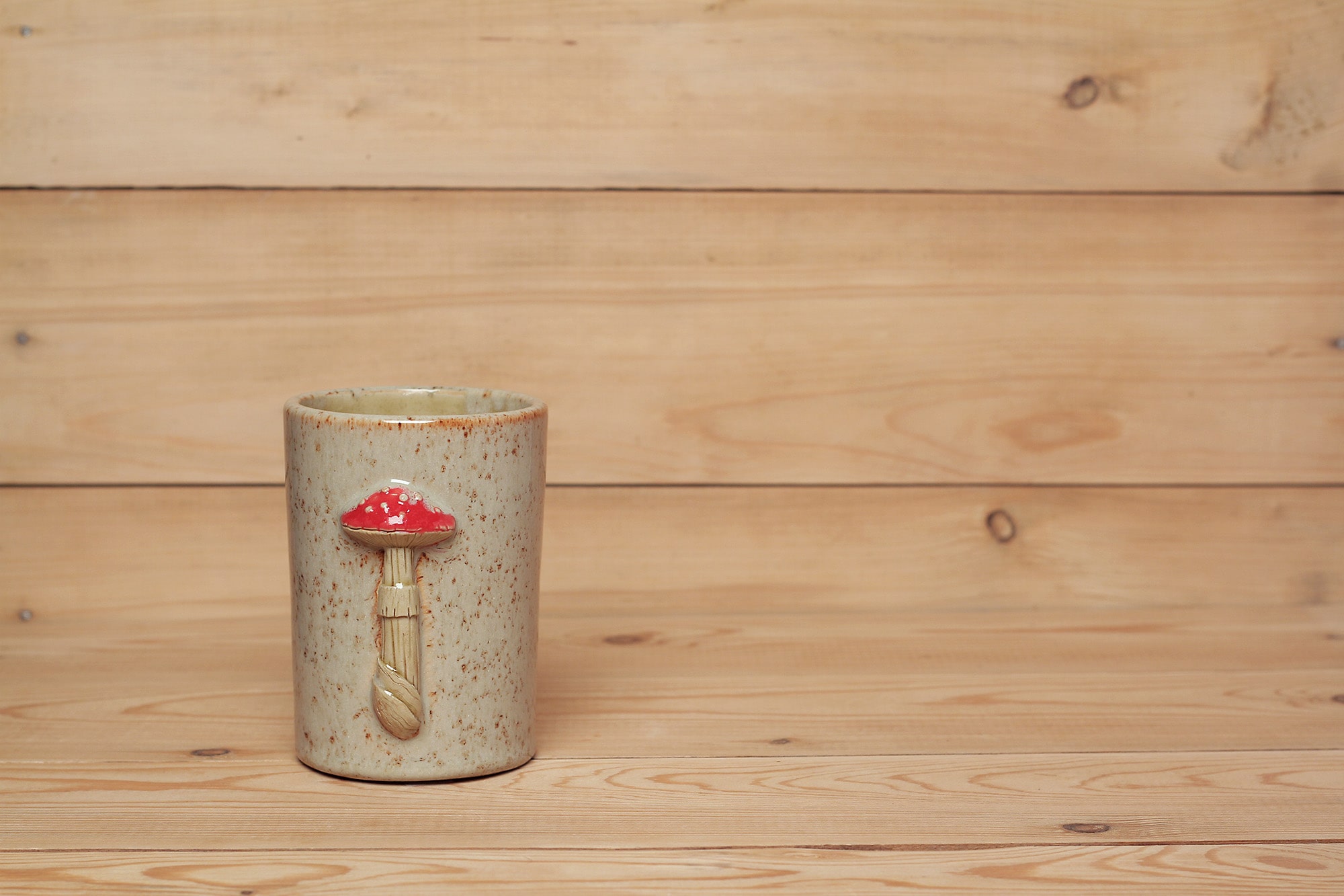 Fehér agyagból készült, magastűzön, 1225 fokon tömörre égetett, plasztikus gomba szobrokkal díszített bögre. Mákos fehér hatású effekt, valamint barnás transzparens mázzal kívül-belül díszítve.