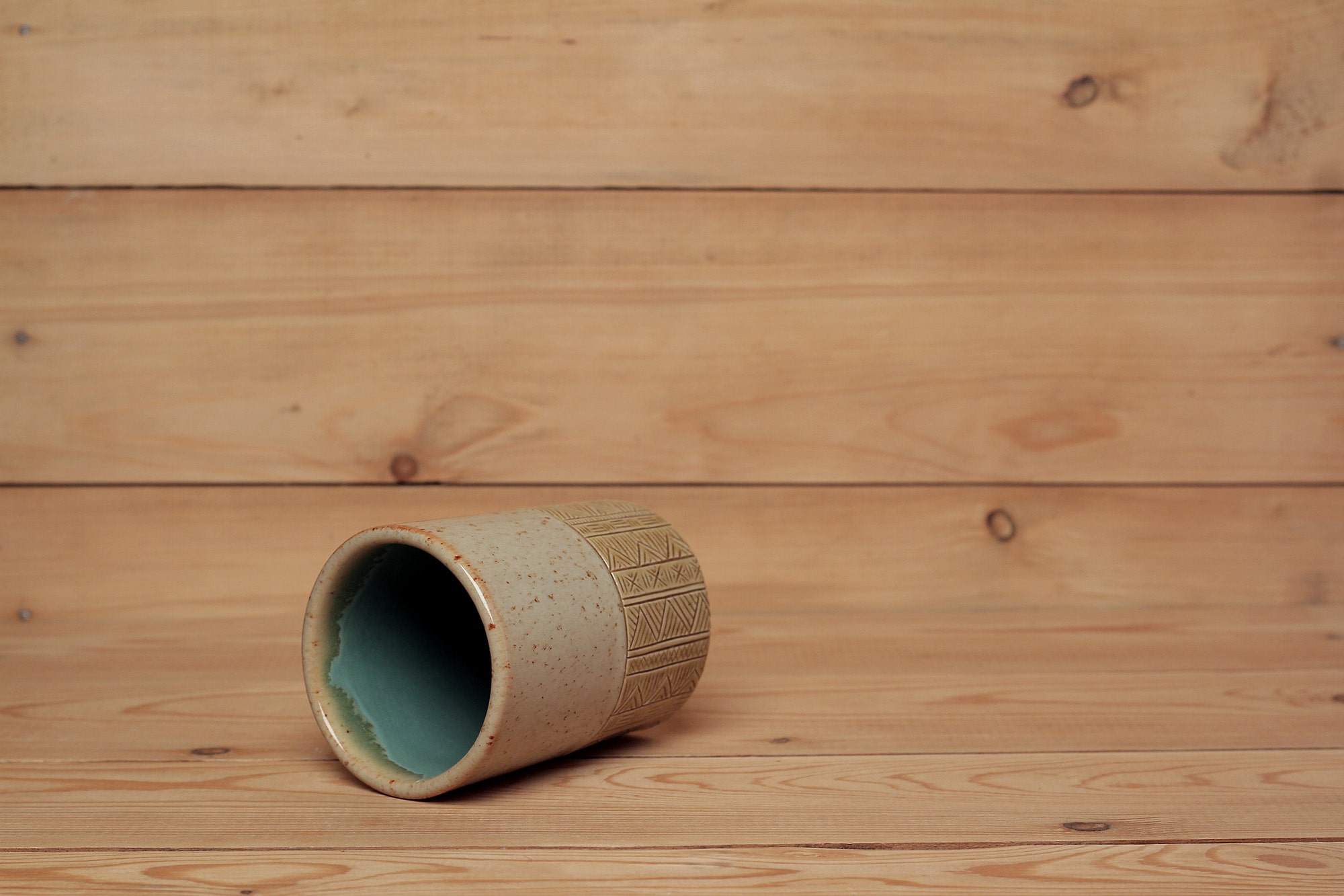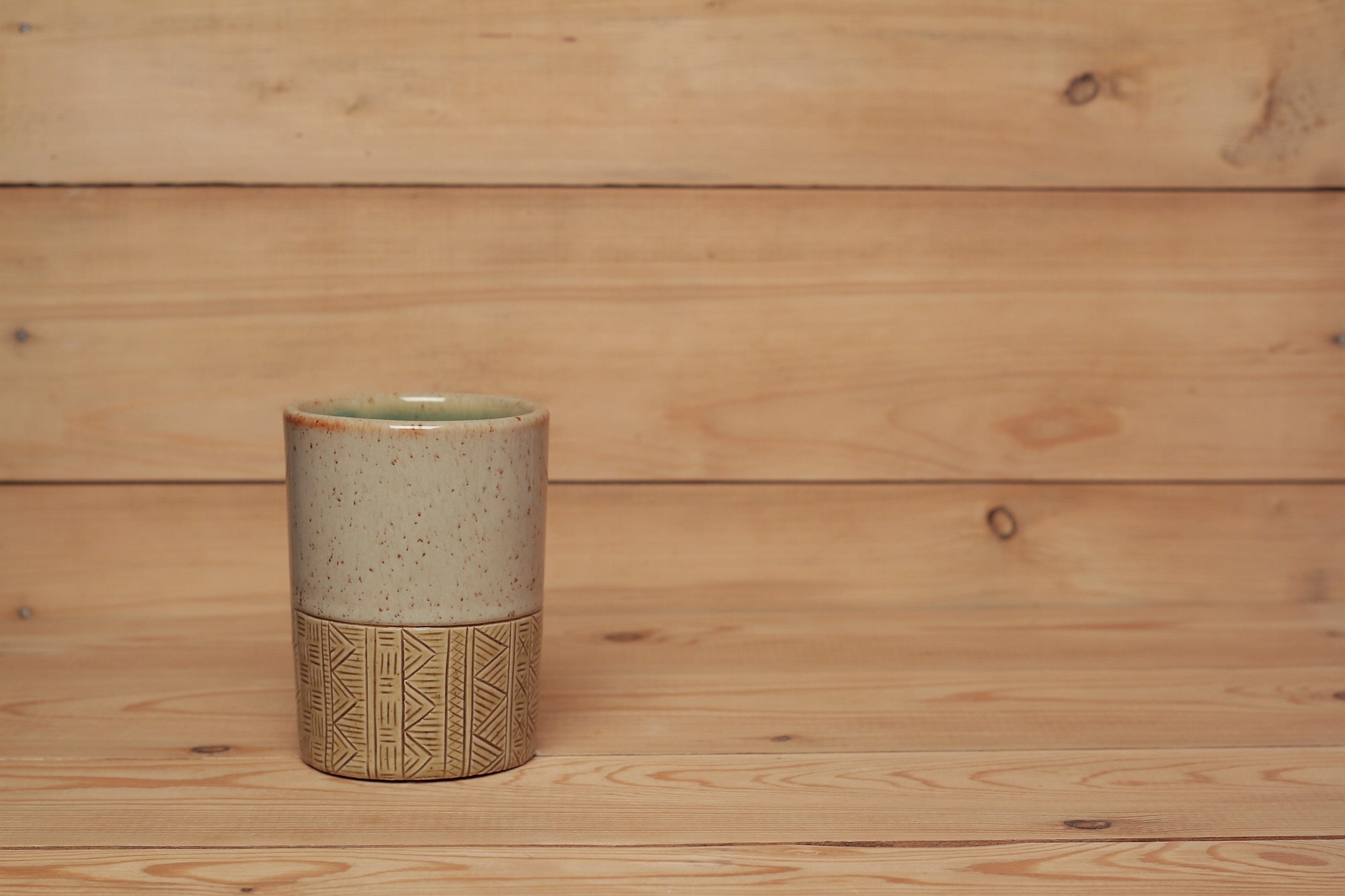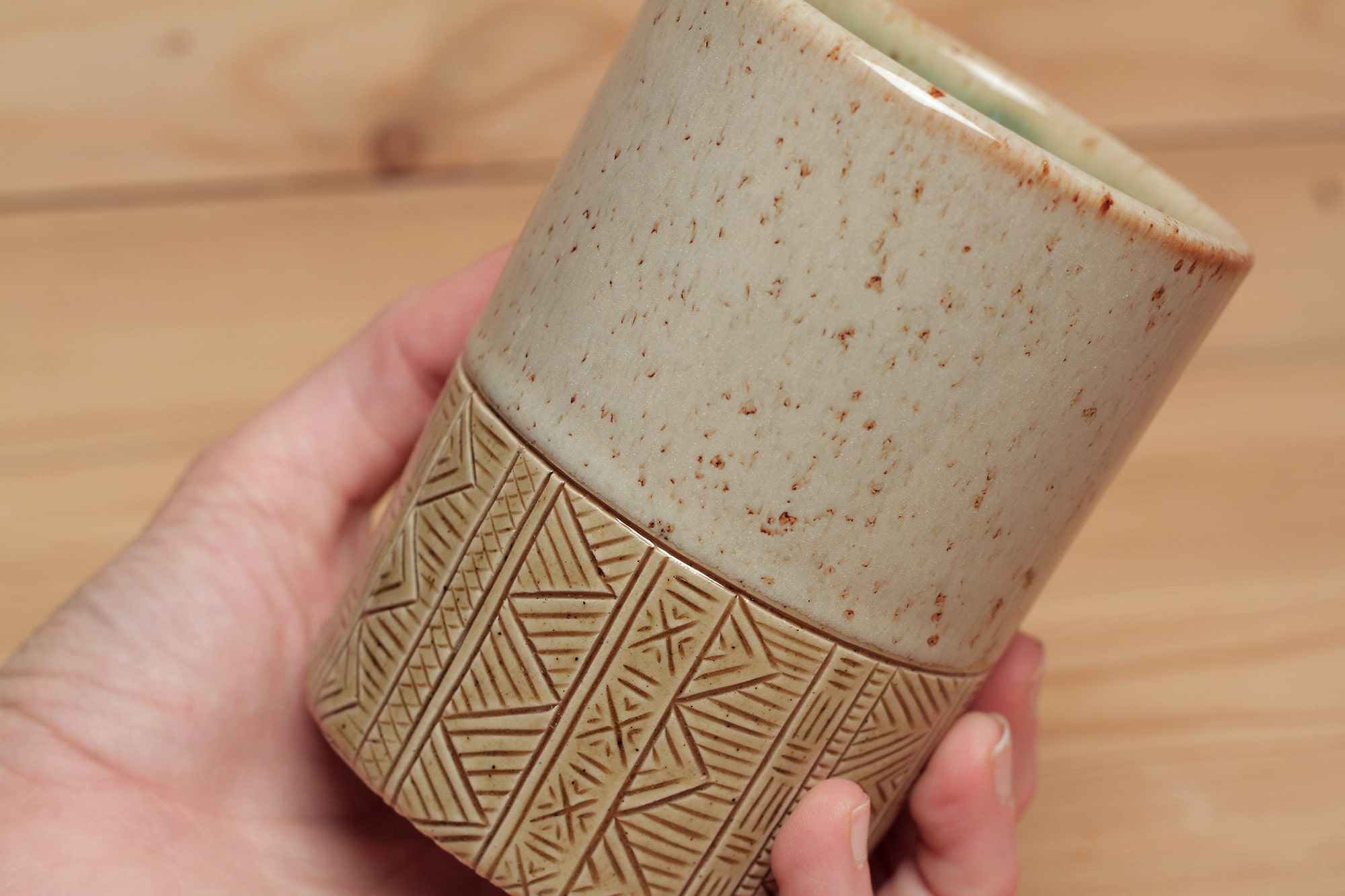 Fehér agyagból készült, magastűzön, 1225 fokon tömörre égetett Tribe mintás bögre karcolt technikával. Effekt és barnás transzparens mázzal kívül-belül díszítve.